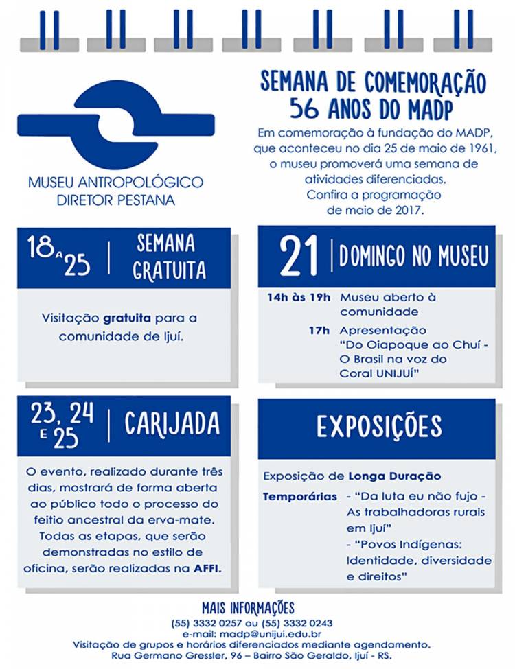 Para comemorar a Semana dos Museus e seu aniversário, o MADP programou uma série de atividades que contemplam desde a publicação de imagens e fatos que contam a sua história em sua fanpage oficial (facebook.com/MADPUNIJUI) até atrações culturais. No domingo, 21 de maio, o Museu abre as suas portas e recebe, a partir das 17h, o Coral da Unijuí para uma apresentação composta por interpretações de músicas da MPB. Nos dias 23, 24 e 25 acontece uma “Carijada”, que mostrará ao público todo o processo de feitio ancestral da erva-mate, as atividades serão realizadas na Associação de Funcionários da Fidene. Além disso, o público pode conferir as exposições temporárias no Museu: “Da luta eu não fujo – As trabalhadoras rurais em Ijuí” e “Povos indígenas: identidade, diversidade e direitos”.
