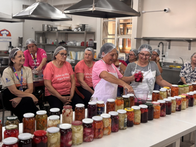 A oficina foi conduzida por Ivone e Marilene Heck, que compartilharam memórias e histórias por meio da prática culinária, resgatando tradições e modos de preparo transmitidos de geração em geração. O trabalho com compotas e conservas despertou lembranças afetivas e aproximou as participantes de práticas que marcaram o cotidiano de suas famílias.