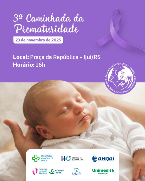 No mês internacional de sensibilização à prematuridade, o Projeto de Extensão “Prematuros: prevenção, apoio e cuidado”, em parceria com o Projeto Prematuros Unijuí Unimed Noroeste/RS, UNIR, Hospital de Caridade de Ijuí (HCI) e Secretaria Municipal da Saúde, Programa Criança Feliz, promove a 3ª Caminhada da Prematuridade.