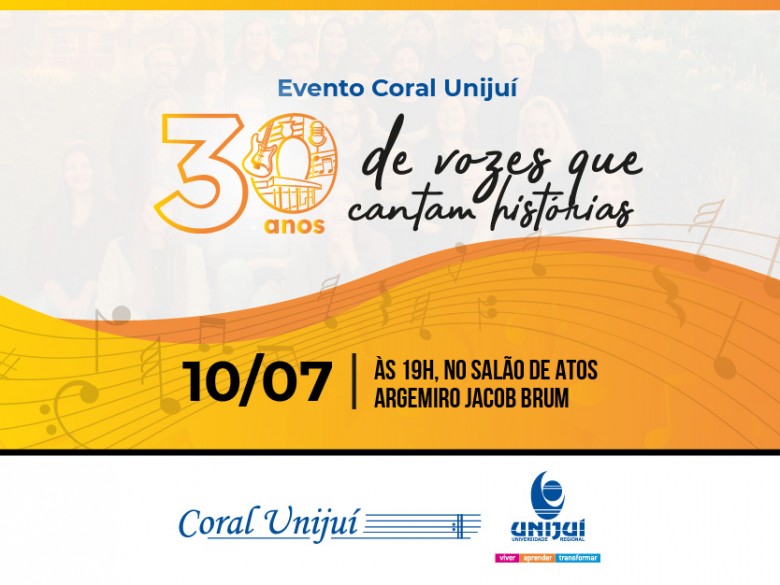 O Coral Unijuí prepara um grande evento para o dia 10 de julho, em comemoração ao seu aniversário de 30 anos. O espetáculo “30 anos de vozes que cantam histórias” acontecerá no Salão de Atos Argemiro Jacob Brum, a partir das 19h. Ingressos já podem ser adquiridos com os integrantes do coro, na Literatus Xok’s e nos caixas da Universidade, ao valor de R$ 20 ou R$ 10 - no caso de estudantes e idosos.