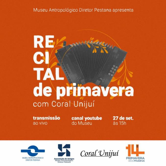 O Museu Antropológico Diretor Pestana, juntamente com o Coral da UNIJUÍ, convidam para o Recital de Primavera que será realizado no dia 27 de setembro, às 15h, no canal YouTube do Museu, neste link.