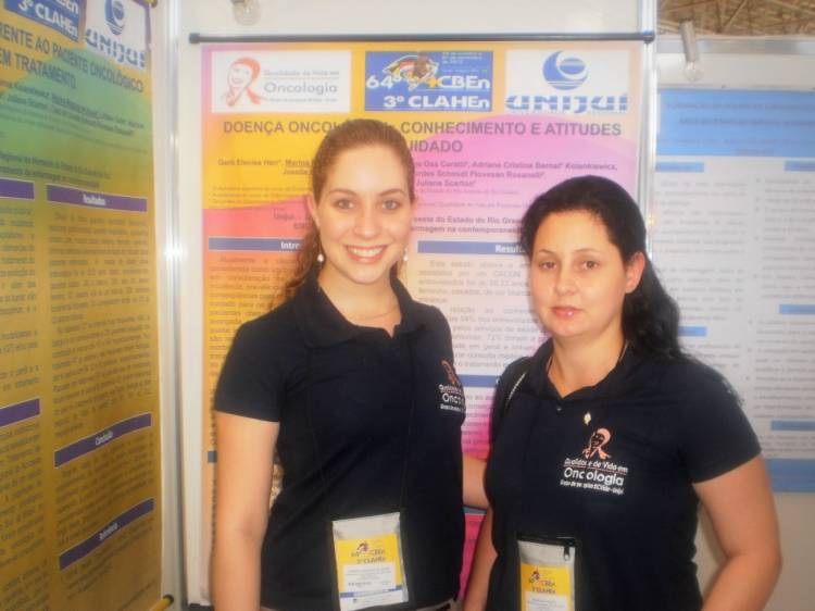 As alunas apresentaram trabalhos resultantes do projeto de pesquisa “Qualidade de vida de pacientes oncológicos assistidos em um Centro de Alta Complexidade”, projeto que participam como bolsistas PIBIC/UNIJUÍ. Os trabalhos aprovados e apresentados pelas alunas foram: A enfermagem frente ao paciente oncológico em tratamento; Doença oncológica: Conhecimentos e atitudes de cuidado; Dificuldades de mulheres em tratamento para o câncer de mama e Enfretamento do câncer de mama, trabalhos orientados pela professora Adriane Kolankiewicz.