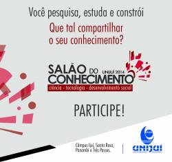 O Salão do Conhecimento é um evento para divulgação da produção em pesquisa e extensão que permite a socialização de experiências e a reflexão sobre as atividades desenvolvidas na UNIJUÍ e em demais instituições participantes, nas diversas áreas de conhecimento, possibilitando aos autores – pesquisadores, extensionistas, estudantes de ensino fundamental e médio, de graduação e de pós-graduação, um espaço de diálogo, de socialização e de trocas de saberes e de experiências entre si e com a comunidade externa.