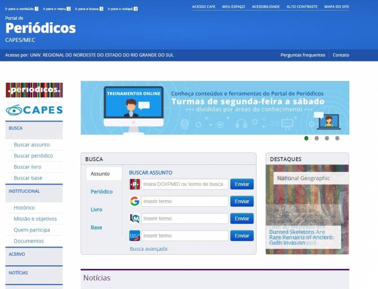 A Coordenação de Aperfeiçoamento de Pessoal de Nível Superior (CAPES) oferece, por meio do Portal de Periódicos, acesso gratuito a conteúdos científicos em todas as áreas do conhecimento a professores, pesquisadores, alunos e funcionários vinculados às instituições participantes do programa.