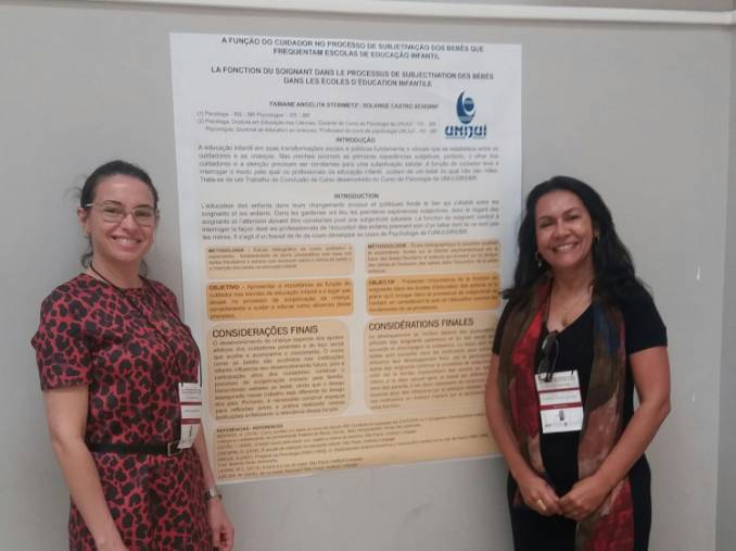 Na oportunidade, a psicóloga Fabiane Steinmetz e a professora Solange Schorn, autora e coautora, respectivamente, apresentaram o trabalho sobre “A função do cuidador no processo de subjetivação dos bebês que frequentam escolas de educação infantil". O estudo consiste em uma parte do Trabalho de Conclusão de Curso (TCC) da autora, exposto em formato de pôster. A produção foi vencedora do Prêmio “Marie Claire Busnel” concedido para o melhor trabalho acadêmico, nesse formato, apresentado no Congresso.