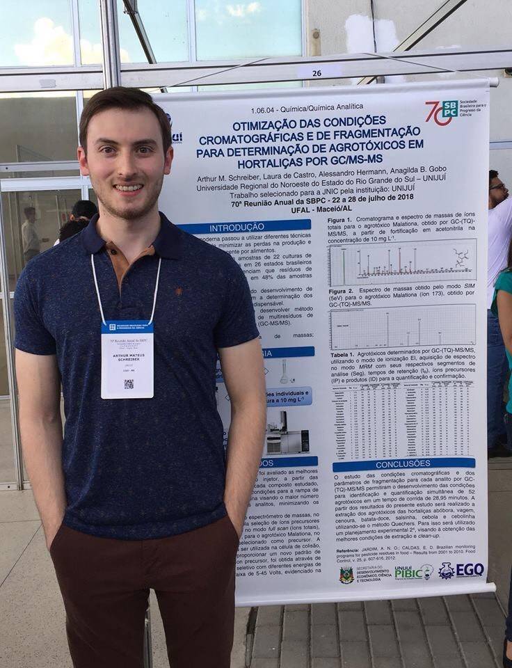 - OTIMIZAÇÃO DAS CONDIÇÕES CROMATOGRÁFICAS E DE FRAGMENTAÇÃO PARA DETERMINAÇÃO DE AGROTÓXICOS EM HORTALIÇAS POR GC/MS-MS – de autoria do bolsista Arthur Mateus Schreiber, sob orientação do Prof. Me. Alessandro Hermann e colaboração de Laura De Castro e Anagilda Bacarin Gobo.