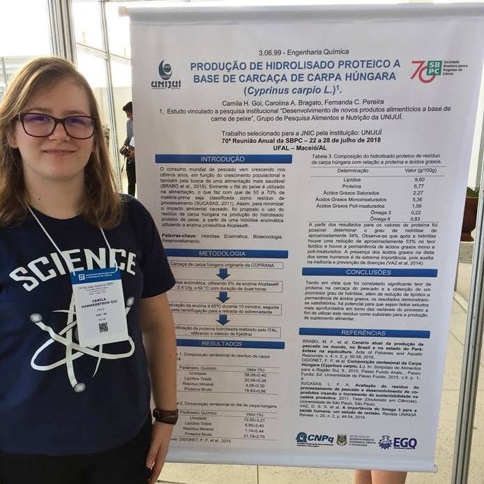 - PRODUÇÃO DE HIDROLISADO PROTEICO A BASE DE CARCAÇA DE CARPA HÚNGARA (Cyprinus carpio L. ) – de autoria da bolsista Camila Hammarstrom Goi, orientada pela Profa. Dra. Fernanda Da Cunha Pereira e colaboração de Carolina Almeida Bragato.