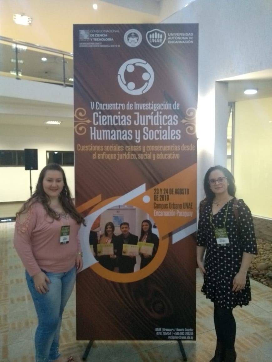 O V ENCUENTRO DE INVESTIGACIÓN DE CIENCIAS JURÍDICAS HUMANAS Y SOCIALES Cuestiones Sociales: causas y consecuencias desde el enfoque jurídico, social y educativo, da UNAE em Encarnación, no Paraguai, teve participação do curso nos dias 23 e 24 de setembro, apresentando os seguintes trabalhos: