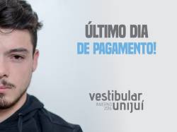Quem fez a inscrição para o Vestibular de Inverno da Unijuí e quiser garantir a sua vaga, deve fazer o pagamento da taxa de inscrição nesta segunda-feira, 27 de junho. A taxa de inscrição é de R$ 60,00 e o pagamento pode ser feito na rede bancária, nas lotéricas, nos caixas da Unijuí e no Polo Ijuí.