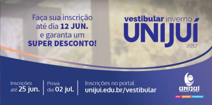 A Unijuí está com inscrições abertas para o Vestibular de Inverno, pelo site unijui.edu.br/vestibular, até o dia 25 de junho. A taxa de inscrição é de R$ 60,00, mas quem fizer a inscrição e o pagamento até o dia 12 de junho recebe desconto e paga R$ 40,00. Também recebem desconto os candidatos que se inscreveram no Profissional do Futuro de 2016 e realizarem sua inscrição e pagamento até o dia 12 de junho, nesse caso o valor da taxa é de R$ 28,00. Depois dessa data, os inscritos no Profissional do Futuro pagam R$ 42,00. O pagamento pode ser feito na rede bancária, nas lotéricas e nos caixas da Unijuí.