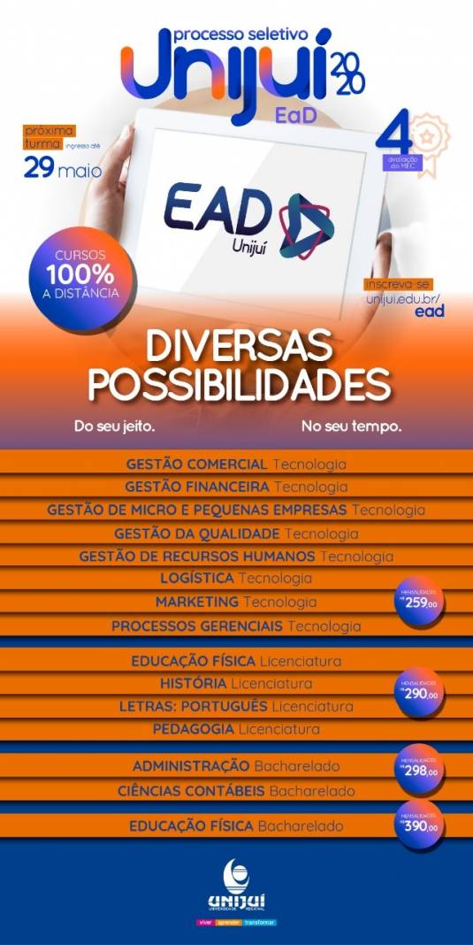 Mesmo diante da pandemia de Coronavírus, que está mudando radicalmente a rotina no país, o processo seletivo para o Ensino a Distância da Unijuí segue o cronograma estabelecido normalmente. Desta forma, novas possibilidades de ingresso na Unijuí estão abertas para 15 cursos, com valores de R$ 259,00 a R$ 390,00. Confira: