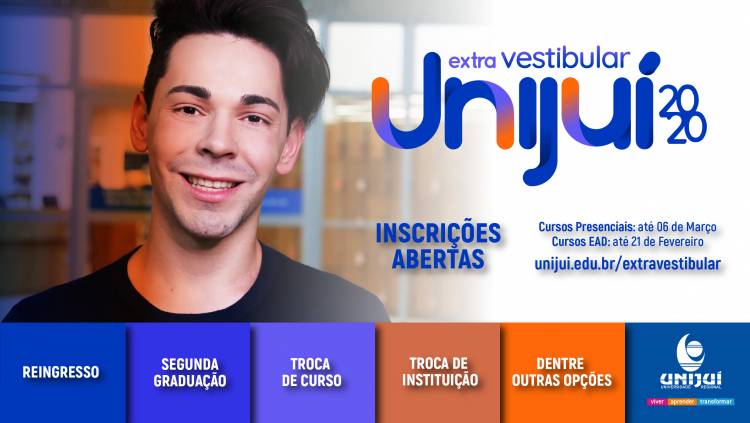 A Unijuí abriu, nesta semana, novas possibilidades de ingresso na Universidade. Por meio do ExtraVestibular, novas opções para quem deseja ingressar, retornar ou trocar de instituição, estão abertas. Fique atento aos prazos: para cursos presenciais as inscrições encerram no dia 06 de março, já para o EaD o prazo final é dia 21 de fevereiro.