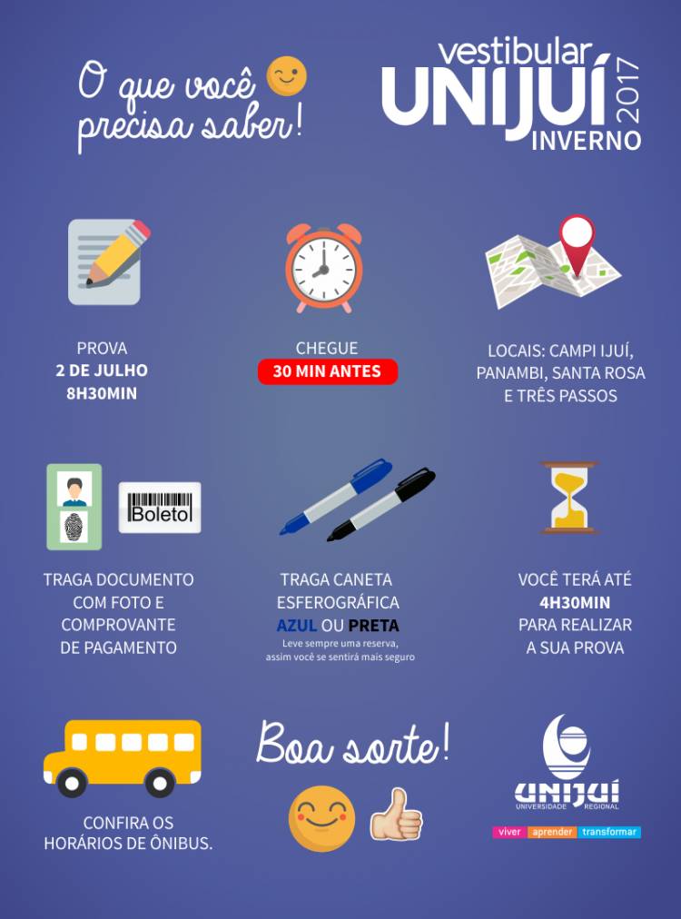 Prova - A prova do Vestibular é de redação e questões objetivas e será realizada no domingo, 02 de julho, das 8h30 às 12h30. Os locais de realização da prova são os campi Ijuí, Panambi, Santa Rosa e Três Passos. O resultado e a lista de aprovados serão divulgados no dia 05 de julho, às 15h. Serão ofertadas 450 vagas na modalidade presencial, em diferentes áreas do conhecimento, nos campi das cidades de Ijuí, Panambi, Santa Rosa e Três Passos.