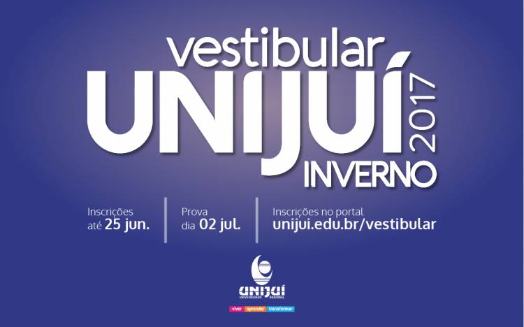 A partir desta segunda-feira, 22, podem ser feitas as inscrições para o Vestibular de Inverno 2017, no portal da Unijuí: unijui.edu.br/vestibular. As inscrições podem ser feitas até o dia 25 de junho. A prova do Vestibular é de redação e questões objetivas e será realizada no domingo, 02 de julho, das 8h30 às 12h30. Os locais de realização da prova são os campi Ijuí, Panambi, Santa Rosa e Três Passos. O resultado e a lista de aprovados serão divulgados no dia 05 de julho, às 15h. Serão ofertadas 450 vagas na modalidade presencial, em diferentes áreas do conhecimento, nos campi das cidades de Ijuí, Panambi, Santa Rosa e Três Passos.