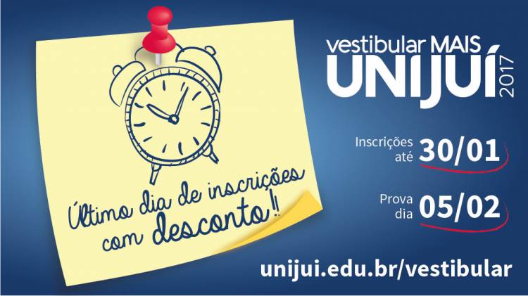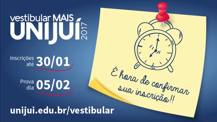 O Vestibular Mais Unijuí encerrou as inscrições ontem, porém, os candidatos tem até esta terça-feira, 31, para realizar o pagamento da taxa de inscrição, no valor de R$ 60,00. O pagamento pode ser feito na rede bancária, nas lotéricas, nos caixas da Unijuí e no Polo Ijuí. A conclusão dessa etapa é fundamental para efetivar a inscrição.