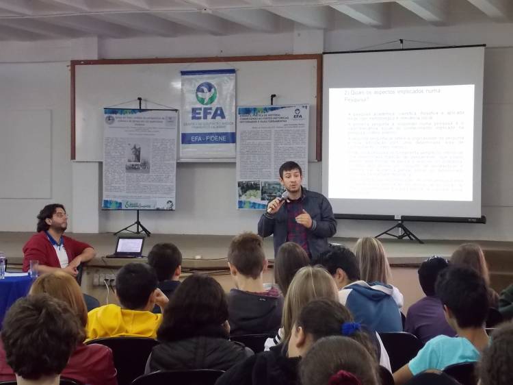 O Centro de Educação Básica Francisco de Assis (EFA) realizou nesta segunda feira, 14 de julho, um painel sobre a Pesquisa na Escola, tendo como base o aluno e o professor como pesquisadores. A atividade foi coordenada pela professora Rosana Barros, coordenadora pedagógica da EFA, e teve como painelistas os professores Josei Fernandes Pereira (EFA) e Sidinei Pithan da Silva (UNIJUÍ). A atividade envolveu estudantes da EFA, do 9º ano do ensino fundamental e turmas do ensino médio, além da escola Rui Barbosa, como convidada. O painel integrou a programação alusiva aos 46 anos da EFA, que são comemorados neste dia 15 de julho. O professor Sidinei iniciou os trabalhos contextualizando a temática “Pesquisa e a Formação Escolar no Contexto Contemporâneo”, trabalhando as diferentes concepções, implicações e formas de se fazer pesquisa, desde a escolha do tema, do problema, do percurso a ser trilhado, da metodologia, da necessária finalização, do trabalho acadêmico e das normas científicas. A exposição do professor centrou, ainda, nos temas de pesquisa e aspectos que podem ser considerados pertinentes aos novos tempos: saber pensar, saber articular ideias, saber escrever, saber socializar e a problematizar questões que, aos olhos de muitas pessoas, estão dados como verdades únicas. Segundo o professor de História da EFA, Josei Fernandes, uma das marcas da escola é sua opção de ensino centrada na pesquisa e na problematização do cotidiano e, a partir daí, a busca pela investigação, ampliada em outros meios que não somente o professor. As alunas do terceiro ano do ensino médio, Luisa Reverey do Prado e Isabel Heberhart também participaram do painel, onde contaram ao público um pouco de suas experiências como alunas pesquisadoras, pois ambas produziram pesquisas que serão apresentadas no Salão do Conhecimento, evento científico da Unijuí. Para complementar os trabalhos, também participou do evento a ex-aluna da EFA Ana Porciuncula Ávila, que relatou a importância da investigação científica e da pesquisa no Ensino Médio, e de como essa bagagem que ela adquiriu na escola está ajudando sua trajetória na Universidade.