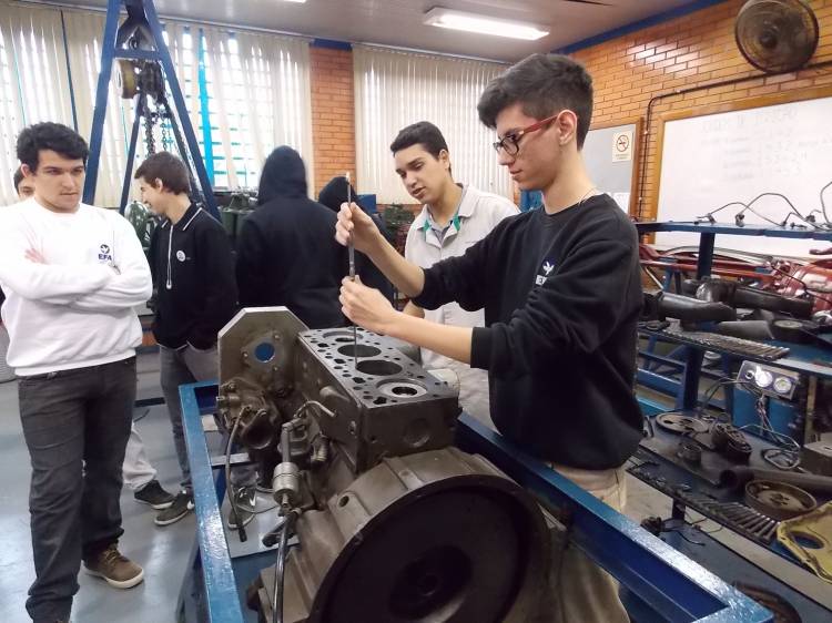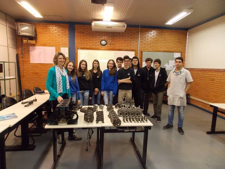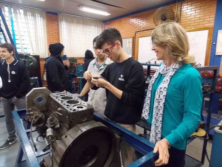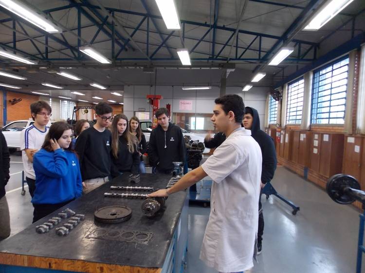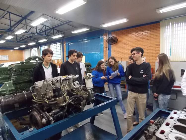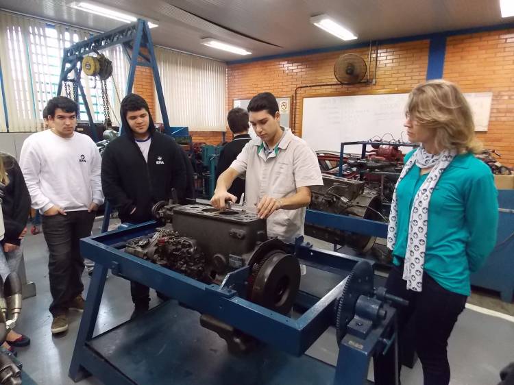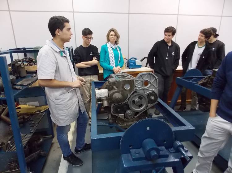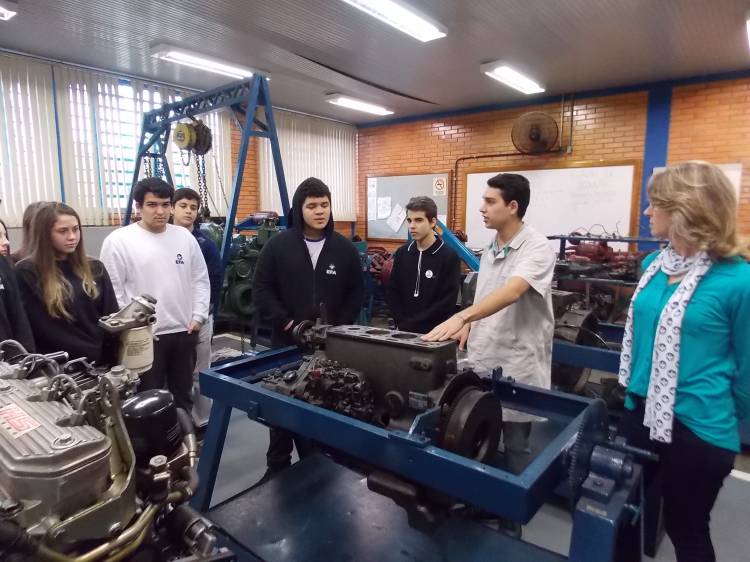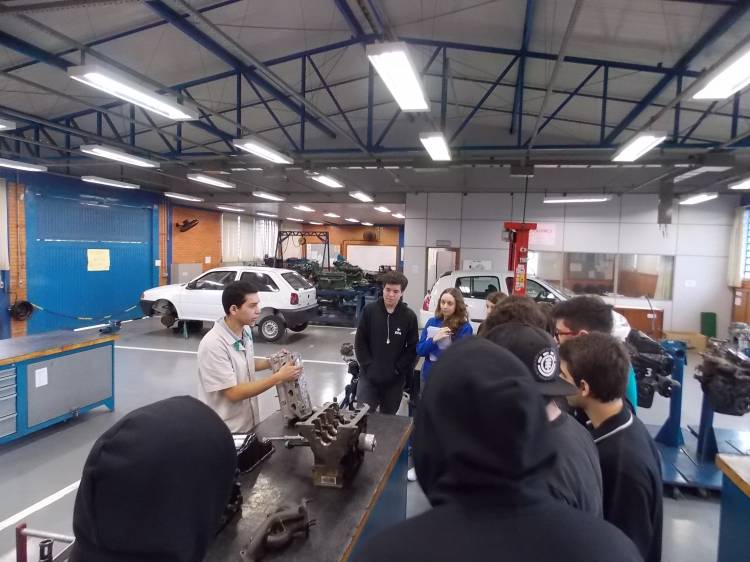 O segundo ano do Centro de Educação Básica Francisco de Assis - EFA, visitou a Oficina Mecânica do SENAI, com o objetivo de observar “in loco” o funcionamento de um motor a combustão. Segundo a professora de Física da escola, Janete Maria Strieder, a ideia da visita a uma oficina mecânica, surgiu da necessidade de obter respostas às inúmeras indagações dos alunos frente ao tema da situação de estudo, “Matéria e Energia: Transformação e Conservação em Processos Naturais e Tecnológicos”, temática essa, que desencadeou diversos questionamentos pertinentes. “Entendemos que obter respostas com pessoas especializadas no ramo mecânico, é uma forma de enriquecer o ensino que encoraja e incentiva a autonomia do aluno para gerar seus próprios conhecimentos vinculados ao seu cotidiano, assim o saber deixa de ser uma mera aquisição de informações para se tornar algo realmente útil para suas vidas”, conta a professora. Através dessa atividade pode se aproximar os conceitos Físicos em questão, a outros componentes curriculares como a Química e a Biologia, por exemplo. Uma vez que, a situação de estudo visa romper com a apresentação linear dos conteúdos científicos, desenvolvendo compreensões interdisciplinares e transdisciplinares. Dessa forma, os conceitos Físicos, Químicos e Biológicos interagem, se complementam, para que os conceitos necessários para compreensão da SE “Matéria e Energia: Transformação e Conservação em Processos Naturais e Tecnológicos” tenham significados reais, ricos de vivências e dinamicamente inter-relacionados. Ainda para a professora Janete Maria Strieder, essa atividade interativa foi de suma importância, uma vez que, ofereceu condições para que o aluno, por meio de ações efetivas, pudesse dar maior sentido ao conhecimento a ser construído.