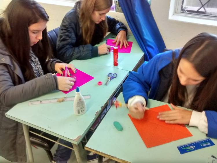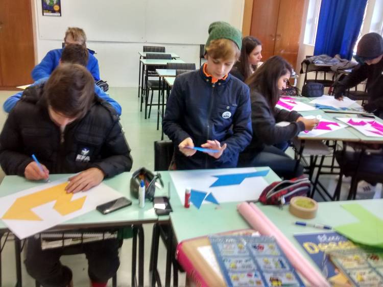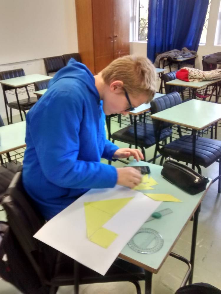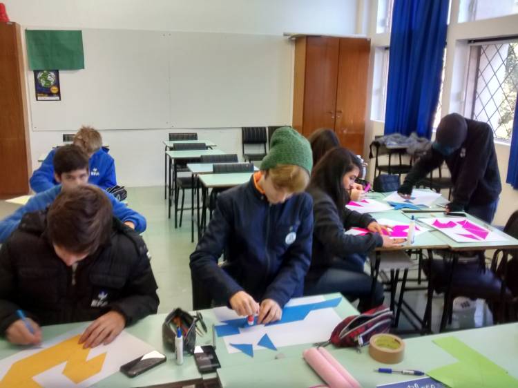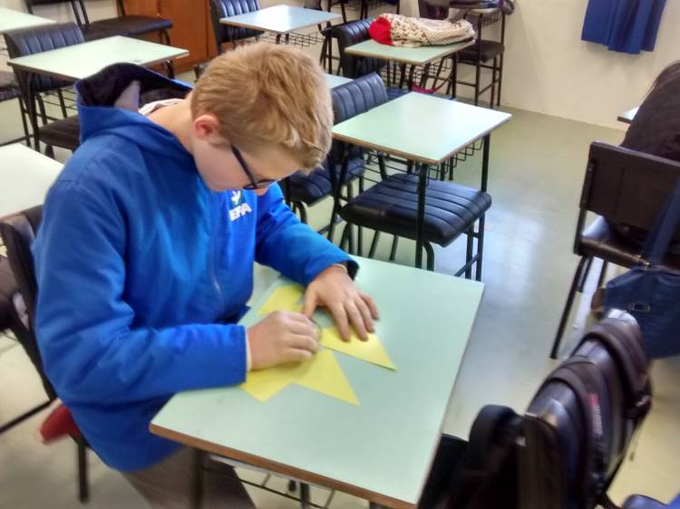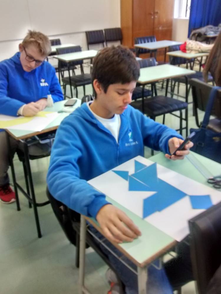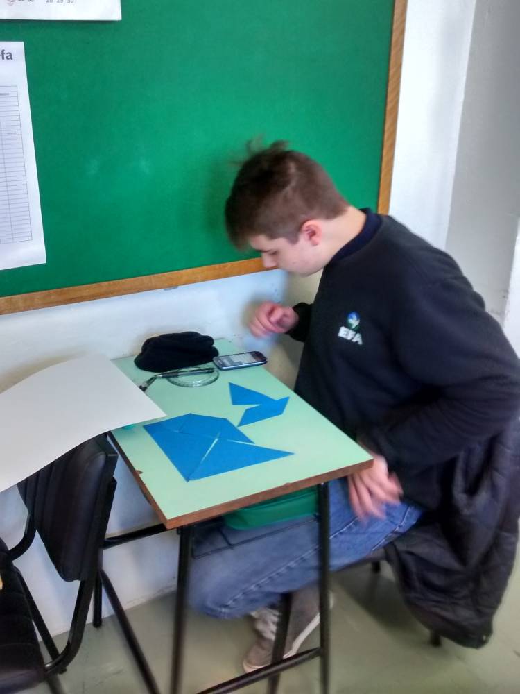 Usando papel colorido, régua e tesoura, os alunos foram desafiados pela professora Carla Dal Molin, a construir seu próprio TANGRAM, através de dobraduras e retas traçadas por régua, orientadas pela professora. Após a construção, e com o uso de um transferidor, mediram os ângulos internos de cada uma das 7 figuras que compõe o quebra-cabeças.