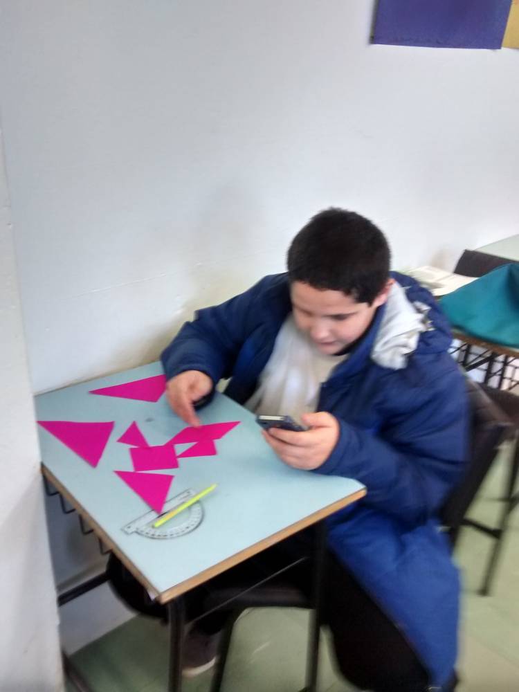 Em seguida, usando o celular como ferramenta de pesquisa em sala de aula, os alunos buscaram e montaram as mais diferentes figuras com as peças do TANGRAM (animais, pessoas, objetos), analisando os ângulos e a proporção em relação ao desenho pesquisado na tela do celular, as quais podem ser visualizadas no corredor da sala da turma.