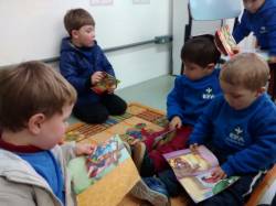 A leitura é preocupação desde a mais tenra idade na EFA. Crianças de 2 anos, da turma A11, do Centro de Educação Básica Francisco de Assis, juntamente com a professora Sonia Falcão e a auxiliar pedagógica Patricia Garcia do Nascimento, estão desenvolvendo várias atividades voltadas a Jornada de Pesquisa Literária que culminará em julho, mês das comemorações de aniversário da Escola.