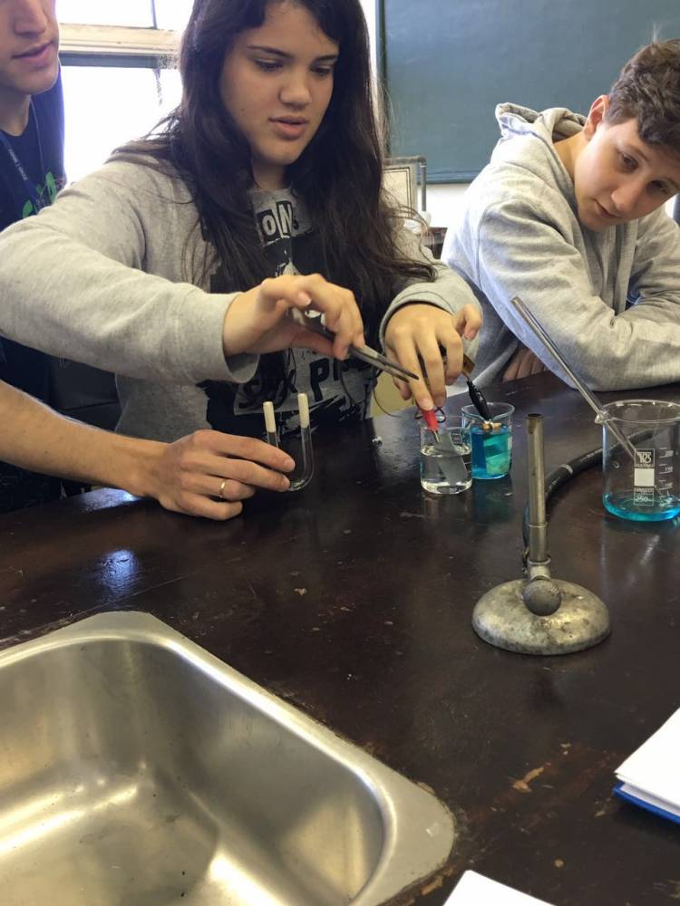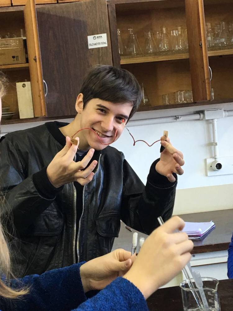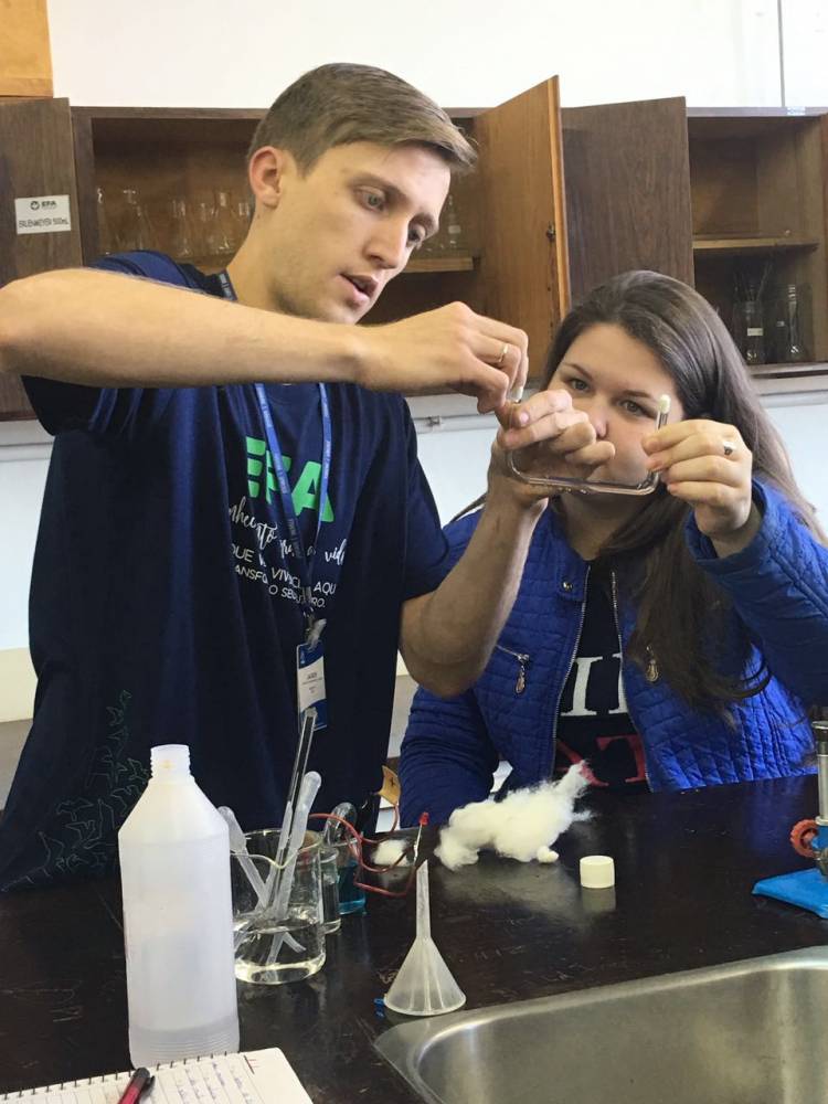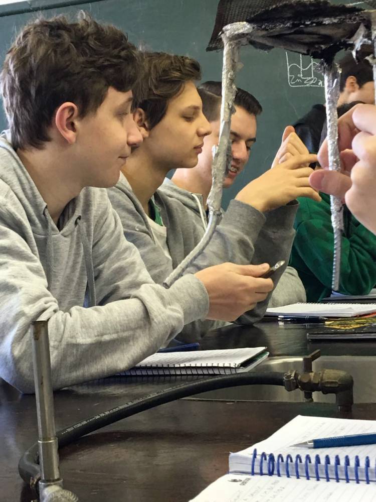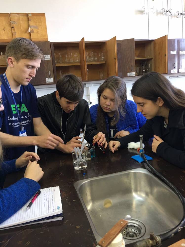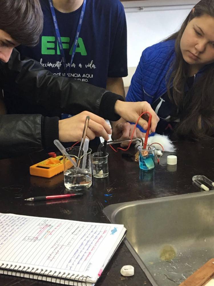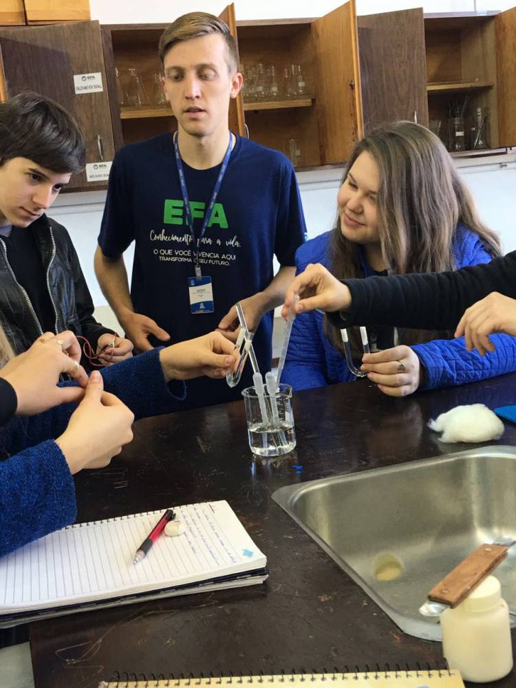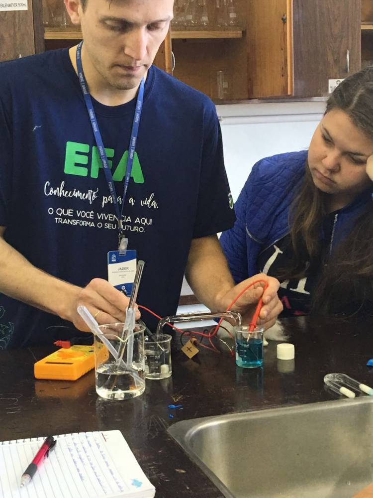 A turma 221, segundo ano do Ensino Médio do Centro de Educação Básica Francisco de Assis/EFA, acompanhada pelo professor Jader da Silveira, foram ao laboratório de Química da EFA realizar um experimento de Eletroquímica. A ciência tem múltiplo papel formativo no Ensino Médio, pode oportunizar um conhecimento crítico do mundo e do tempo em que se vive, pela capacidade de mobilizar o conhecimento científico, questionando e analisando ideias e fatos em profundidade, avaliando a confiabilidade de informações e dados e podendo elaborar hipóteses e argumentos com base em evidências. Essa dimensão formativa envolve reflexão sobre os fundamentos dos vários saberes e possibilita ao estudante reconhecer o caráter histórico e transitório do saber científico, bem como a possibilidade de diálogo com outras formas de conhecimento e com outras convicções.