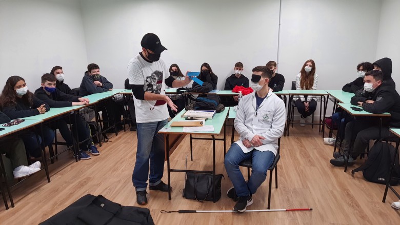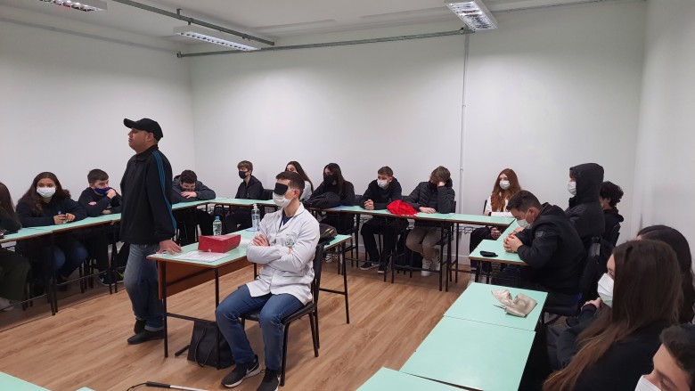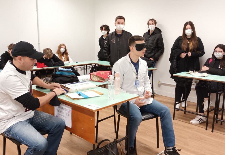 A manhã do dia 10/08 foi muito especial para os estudantes da turma C91 da EFA. Em parceria com os estagiários do Curso de Nutrição, as professoras Janaina Feller de Arte, e Karina Rios orientadora do Estágio em Nutrição Clínica II, promoveram um momento de reflexões valorizando os 5 sentidos. Ao adentrar o espaço do CER III, alguns estudantes do nono ano foram convidados a participar de uma dinâmica de sensibilização, onde a visão ou a mobilidade de algum membro do corpo fora comprometida. Na sequência, recebemos o convidado Luciano Perkoski, que através de uma conversa leve e produtiva compartilhou como é sua convivência com a doença "retinose pigmentar" que ocasionou a perda da visão, ainda jovem. O mesmo partilhou algumas experiências e nos alertou para as necessidades que um cego tem em relação a mobilidade nos espaços públicos, além de outras informações relevantes e dúvidas dos alunos. Luciano falou sobre empatia, respeito e valores, nos fazendo refletir sobre nossas atitudes diárias com nossos semelhantes. Finalizamos o encontro com uma meditação guiada pelo estagiário Jean Régis que nos direcionou a "comer com consciência", estar presente e apreciar o aqui e agora.
