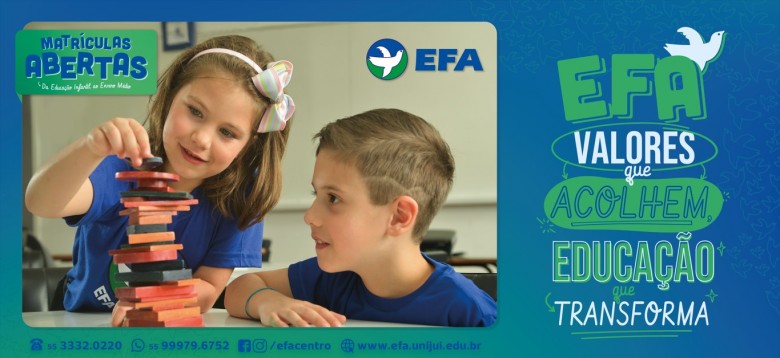 A EFA é uma escola conectada com o que crianças e jovens precisam para seu desenvolvimento intelectual e social, enfatizando o saber científico e suas múltiplas possibilidades, de modo a contribuir na formação humana de sujeitos críticos, empáticos, solidários, autônomos, capazes de contribuir de forma ética para uma sociedade democrática. Visando ampliar conhecimentos e atingir os propósitos de ensino humanizador, de excelência, e com vistas a aprendizagens contextualizadas e significativas, que estimulam a investigação, o protagonismo, a criatividade e a inovação, a escola iniciará o ano de 2023 com diversos projetos e espaços para os estudantes, cada um deles pensado e elaborado para os diferentes níveis de ensino, sendo um diferencial importante na formação dos mesmos, como o projeto “ Leitura ao Pé do Ouvido” para Educação Infantil, “1. 2 , 3… É hora da História e Criação para Anos Iniciais.