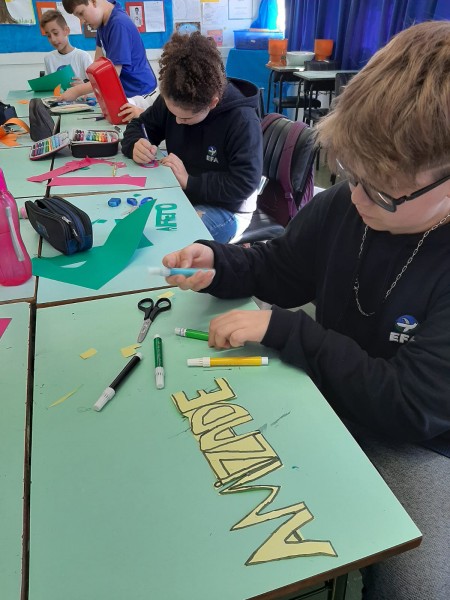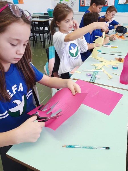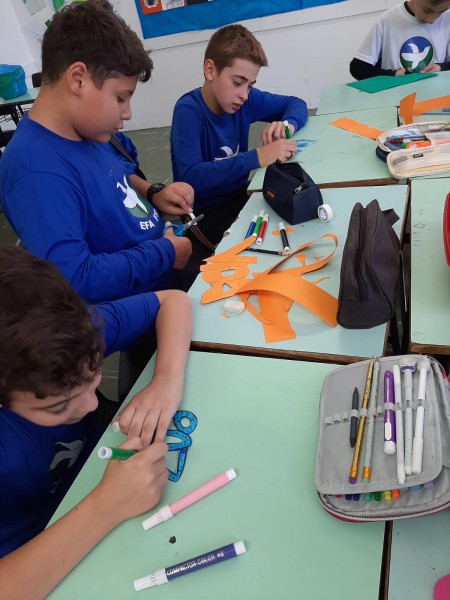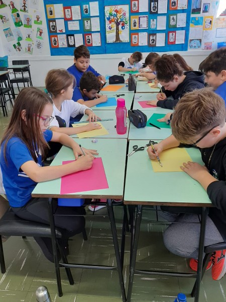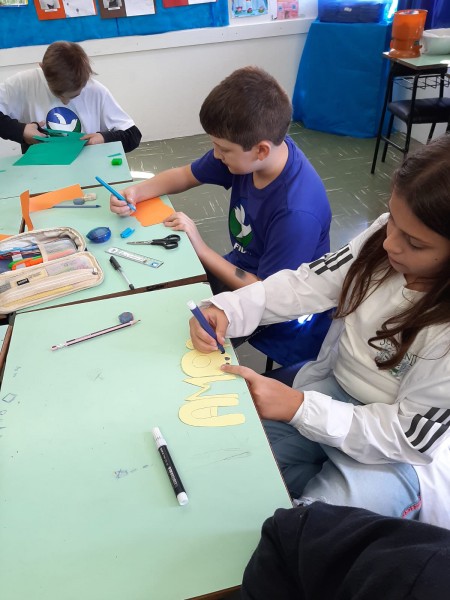 Os estudantes também confeccionaram palavras em letras vazadas, unindo-se em uma corrente do bem com as demais turmas que estão expostas pela escola. Ainda, com a intenção de dar continuidade às atividades, os estudantes levaram para casa um marcador de página constando uma mensagem coletiva da escola, com ações a serem realizadas com as famílias em outros espaços.