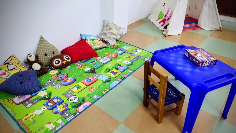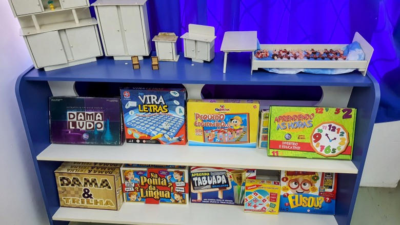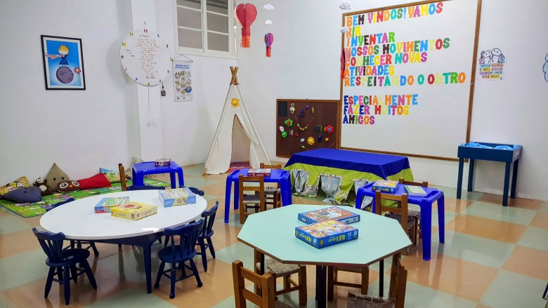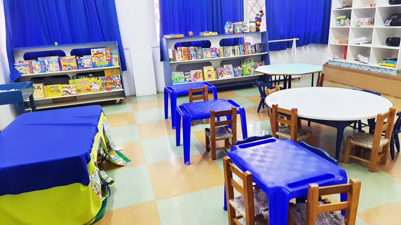 O espaço é dividido em diferentes áreas temáticas, cada uma projetada para atender a uma variedade de interesses e habilidades dos alunos, como o cantinho da cabana com um tapete macio e colorido, que convida as crianças a se sentarem e explorarem jogos de cartas, uma área de jogos com blocos de construção, encaixes e peças para montagem, criar estruturas, veículos e formas usando sua imaginação e coordenação motora, jogos de encaixe e coordenação, com mesas baixas projetadas para promover o desenvolvimento cognitivo e a habilidades motoras, além de uma área de jogos cooperativos que incentivam a interação, a tomada de decisões coletivas para alcançar objetivos comuns.