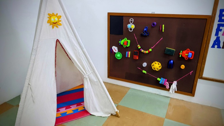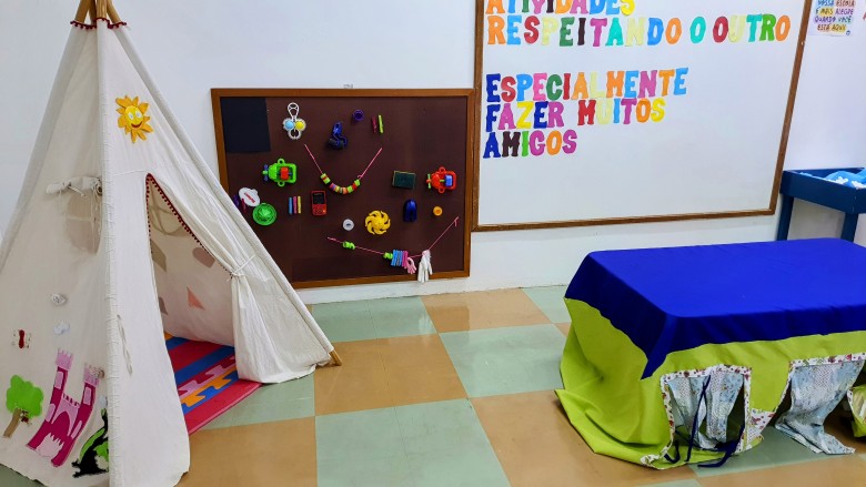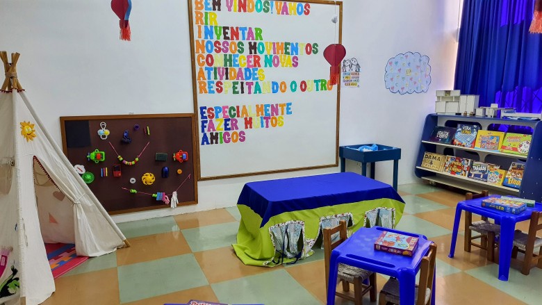 Ao chegar na sala, as crianças são imediatamente recebidas por cores alegres e uma decoração lúdica que estimula a imaginação. As paredes são adornadas com diversos desenhos e objetos familiares do cotidiano, tudo isso para criar um ambiente acolhedor e envolvente, além do mobiliário ser dimensionado para o tamanho dos estudantes, garantindo que elas possam interagir confortavelmente com o ambiente. A supervisão de educadores é essencial para garantir um ambiente seguro e orientar as crianças em suas atividades.