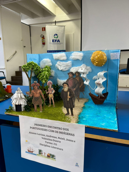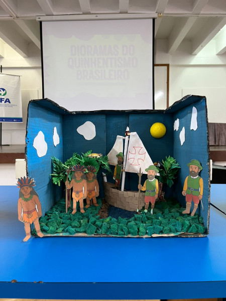 Com base nesse conhecimento, os grupos de estudantes deram início à construção dos dioramas, utilizando técnicas artísticas e recursos visuais variados. Papel, tinta, argila, tecidos e materiais recicláveis foram transformados em verdadeiras maquetes narrativas, que ilustraram episódios marcantes do Quinhentismo, como o encontro entre indígenas e portugueses, as descrições da natureza exuberante e os primeiros contatos culturais e religiosos.