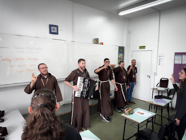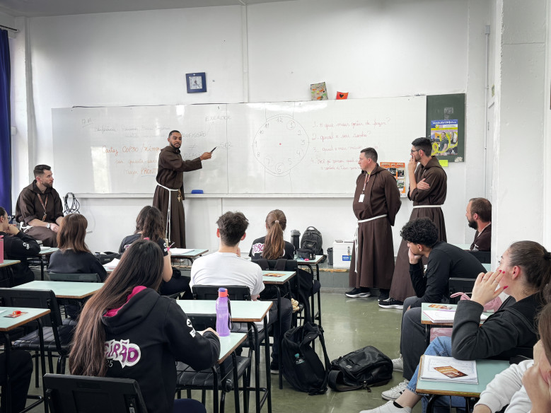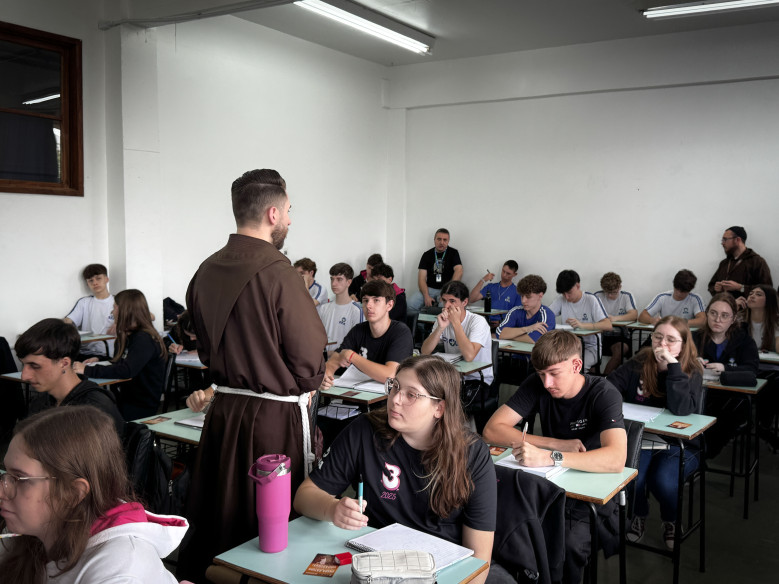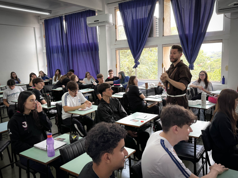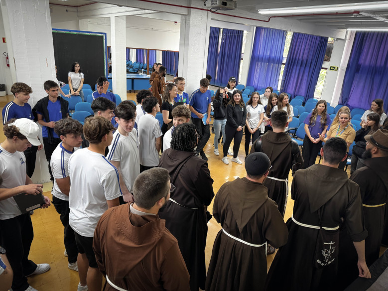 A atividade também integrou o trabalho da escola em apresentar aos estudantes diferentes possibilidades de futuros. Nesse contexto, a presença dos freis contribuiu para ampliar o olhar sobre as diversas vocações.