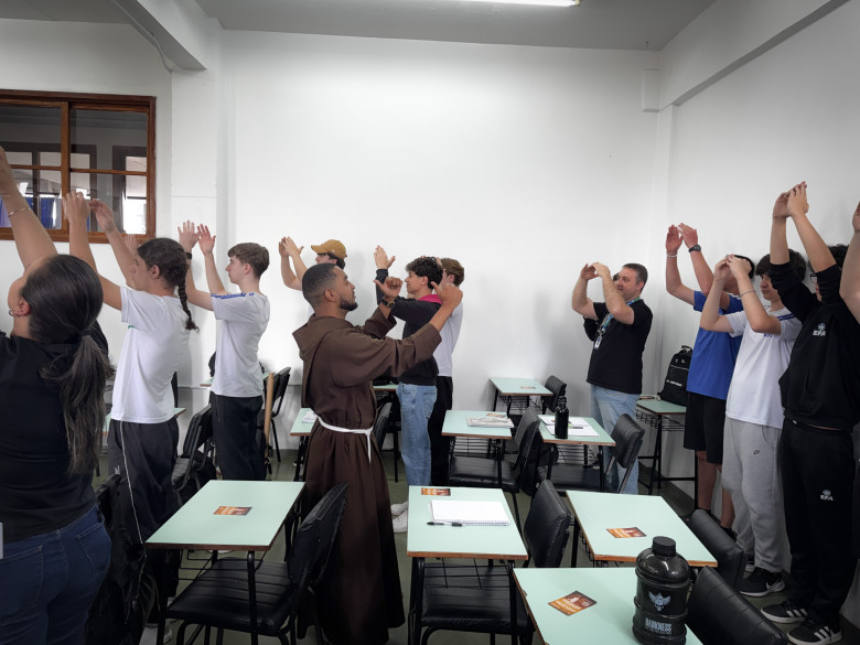 O encontro foi marcado por um clima alegre e descontraído, repleto de aprendizagens. Por meio de reflexões, música e dança, os freis envolveram os jovens em uma vivência dinâmica, permitindo que os estudantes esclarecessem dúvidas sobre a vida monástica e o dia a dia da ordem.