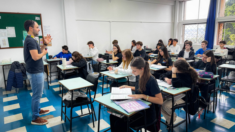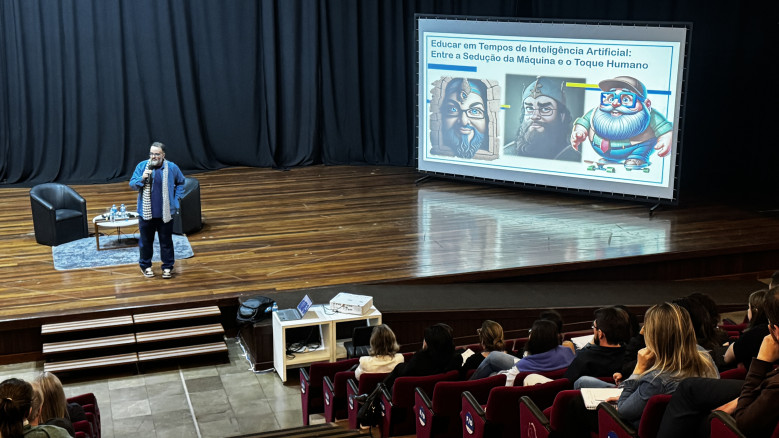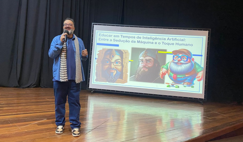 Na última quinta-feira, 07, os professores e funcionários da EFA, eternos estudantes, fizeram uma parada pedagógica para participar da formação “O contexto do ensino e da aprendizagem com a Inteligência Artificial”, feita pelo professor do Instituto Federal Goiano, Rogério Justino, promovida pelo Núcleo de Inovação Pedagógica (NIP) da Unijuí.