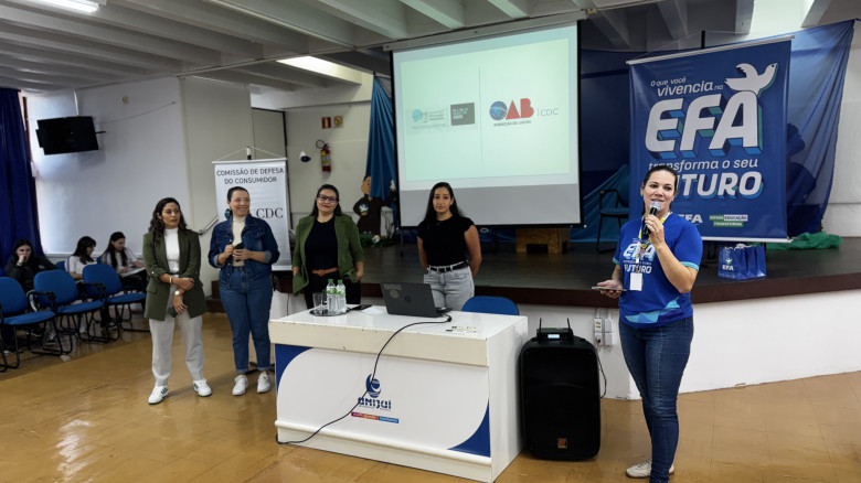 A convite da escola, a Comissão de Defesa do Consumidor da OAB Ijuí marcou presença, trazendo expertise e informações valiosas sobre o universo financeiro. A responsável por conduzir a palestra foi Maria Luísa Viana, renomada advogada com especialização em direito bancário e coordenadora da referida comissão.
