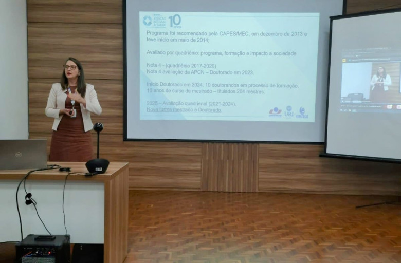 Ao decorre do evento, a coordenadora do programa, professora Adriane Kolankiewicz acolheu a todos os discentes presentes em especial aos ingressantes na turma 2025, reforçou a identidade do programa, seu compromisso com a formação interdisciplinar e seu papel na produção de conhecimento voltado para os desafios da saúde contemporânea. Em seguida apresentou o programa, seus objetivos e estrutura curricular. “Esse encontro inicial permite não apenas a familiarização com a estrutura acadêmica e as diretrizes do programa, mas o encontro com os professores orientadores, o alinhamento de expectativas e a construção de um ambiente colaborativo entre discentes e docentes”, apontou a coordenadora.