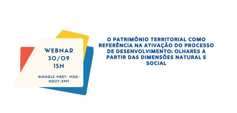 Na próxima quinta-feira, 30 de setembro, a partir das 15h, acontece o webinar “O patrimônio territorial como referência na ativação do processo de desenvolvimento: olhares a partir das dimensões natural e social”. O evento será transmitido pelo Google Meet, neste link.