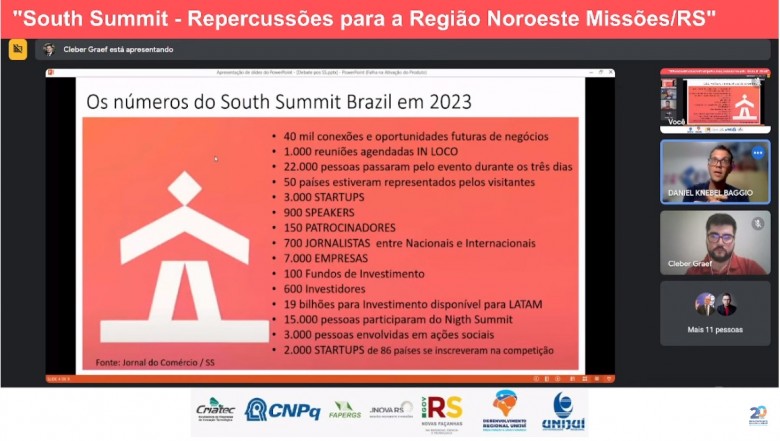 A Agência de Inovação Tecnológica (Agit) e o Programa de Pós-Graduação Stricto Sensu em Desenvolvimento Regional (PPGD) da Unijuí promoveram, na noite desta quinta-feira, 5 de abril, um encontro online com o objetivo de repercutir para a região Noroeste e Missões as discussões e novidades apresentadas durante o South Summit, evento realizado em Porto Alegre na última semana, entre os dias 29 e 31 de março.