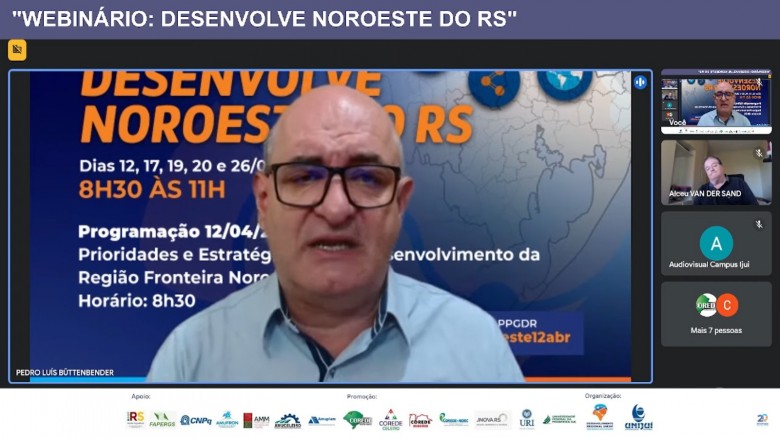 O primeiro webinar realizado hoje, debateu as prioridades e estratégias de desenvolvimento da região Fronteira Noroeste. Conforme explica o professor do PPGDR, Pedro Büttenbender, a série busca dinamizar, divulgar e, ao mesmo tempo, abrir um espaço público para a discussão com a comunidade regional acerca da realidade atual, “bem como as prioridades que estão sendo definidas dentro dos planos estratégicos para que, de forma integrada e articulada entre as quatro regiões, constitua-se uma agenda conjunta de prioridades, respeitando as agendas individuais em cada microrregião”, frisou.
