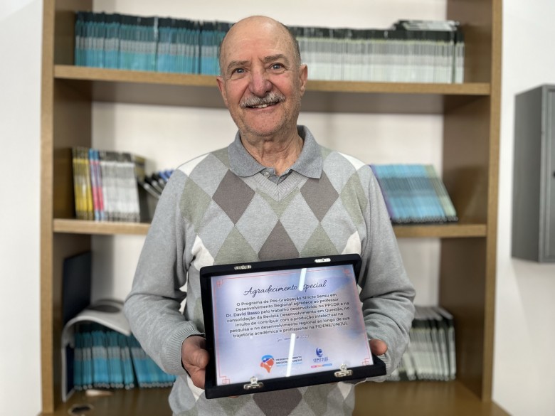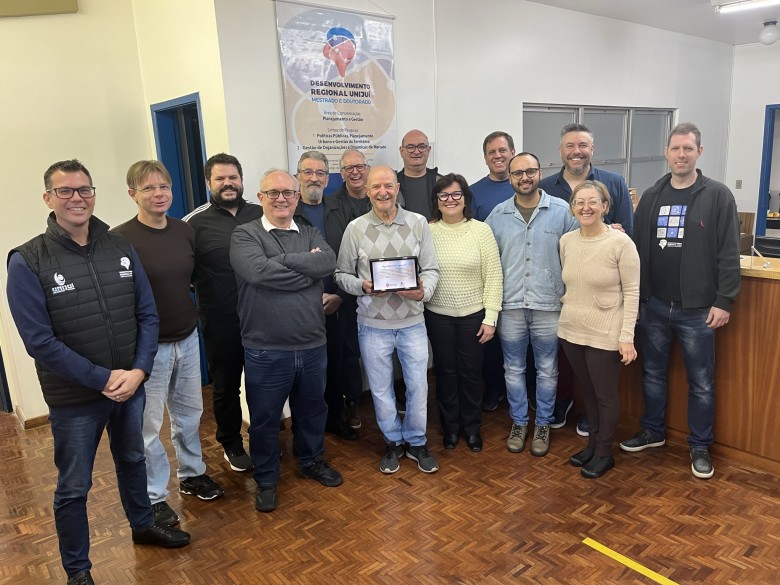 O Programa de Pós-Graduação Stricto Sensu em Desenvolvimento Regional da Unijuí (PPGDR) realizou na manhã desta quarta-feira, 6 de setembro, uma homenagem ao professor David Basso durante reunião do colegiado. Na ocasião, foi entregue uma placa de agradecimento por sua contribuição ao programa e trabalho junto ao Comitê Editorial da Revista Desenvolvimento em Questão.