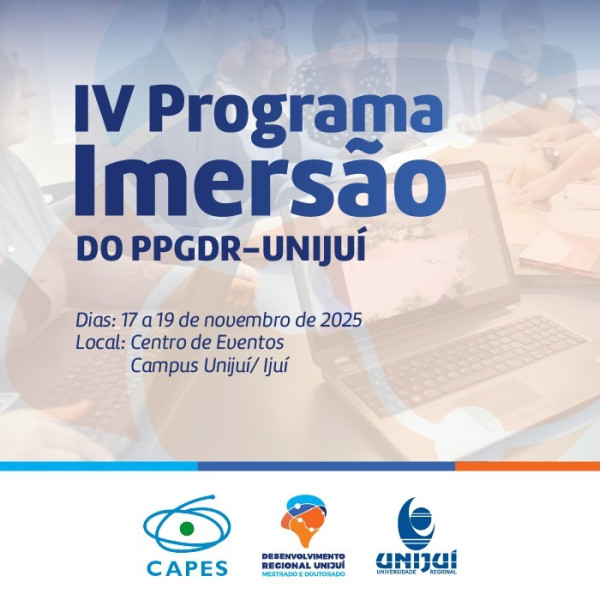 O Programa de Pós-Graduação em Desenvolvimento Regional (PPGDR) da Unijuí promoverá nos dias 17, 18 e 19 de novembro a quarta edição do Programa Imersão PPGDR, uma atividade concentrada, que reunirá mestrandos, doutorandos, docentes e egressos em um espaço de trocas, integração e reflexão sobre os desafios do desenvolvimento regional. O evento será realizado no Centro de Eventos da Unijuí, no Campus Ijuí.