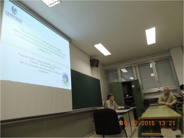 Dando sequência às atividades, a mestranda Franciele Kollas realizou conferência no Master de Didácticas en el Aula, Museos y Espacios Naturales, e no Master Formación de Professorado de Enseñanza secundaria obligatoria y Bachillerato, intitulada: “PRODUCCIÓN Y EMPLEO DE MATERIAL DIDÁCTICO AUDIOVISUAL EN EL CONTEXTO DE LA SITUACIÓN DE ESTUDIO -SOSTENIBILIDAD AMBIENTAL”. Ambas conferências tiveram o objetivo de relatar a experiência de pesquisa que vem sendo desenvolvida aqui no Brasil em uma escola de educação básica, pela mestranda e membros do Grupo Interdepartamental de Pesquisa sobre Educação em Ciências – GIPEC – UNIJUÍ, com intuito de articular o ensino de ciências e o uso do recurso tecnológico, a fim de propiciar reflexão e mudanças de hábitos na comunidade escolar, em busca de um ambiente mais equilibrado.