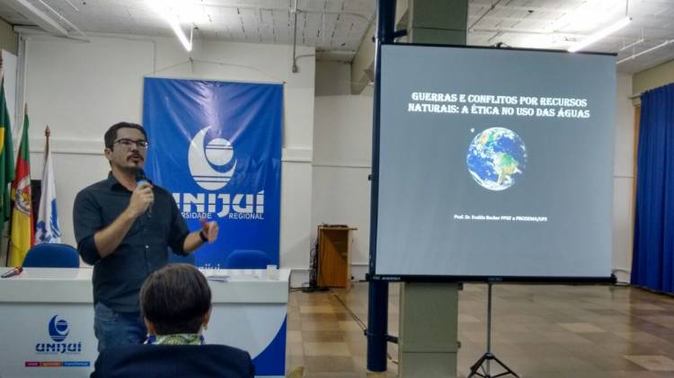 Na primeira palestra, realizada no turno da manhã, o professor doutor Evaldo Becker falou sobre o tema “Guerras e Conflitos por recursos naturais: a ética no uso das águas”. Segundo Becker, a má gestão dos recursos hídricos tem gerado conflitos no Brasil e até guerras em outros países. “Com todo o conhecimento disponível, como a gente ainda despreza este elemento vital? ”, questionou o palestrante. Ainda de acordo com ele, este recurso deverá, cada vez mais, ser disputado. “Já existem monopólios se estabelecendo como donos da água no mundo”, observa.