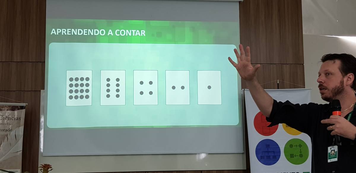 Na parte da tarde, o professor desenvolveu a oficina de “Pensamento Computacional Desplugado”, através de uma série de atividades e jogos elaborados por ele. Conduziu os participantes a compreenderem sua proposta de desenvolvimento desta “forma de pensar”, sem a utilização de computadores.