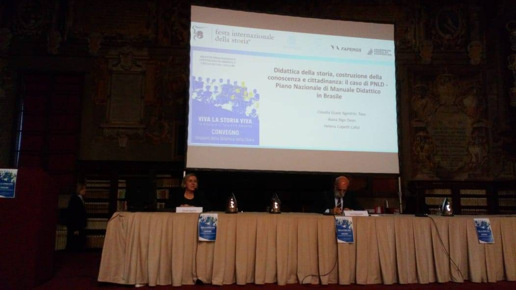 Nos dias 6 e 7 de novembro, noConvegno Internazionale Orizzonti della Didattica della Storia, a pós-doutoranda Cláudia Ilgenfritz Toso e a doutoranda Alana Rigo Deon representaram o Grupo na Tavola Rotonda: Narrare la storia com o trabalho: Didattica della Storia, costruzione della conoscenza e cittadinanza: il caso di PNLD - Piano Nazionale di Manuale Didattico in Brasile (com publicação na Rivista open access “Didattica della storia. Journal of Didactis of History”, da qual a professora Helena é membro do Conselho editorial (https://dipast.wixsite.com/orizzontididattica).