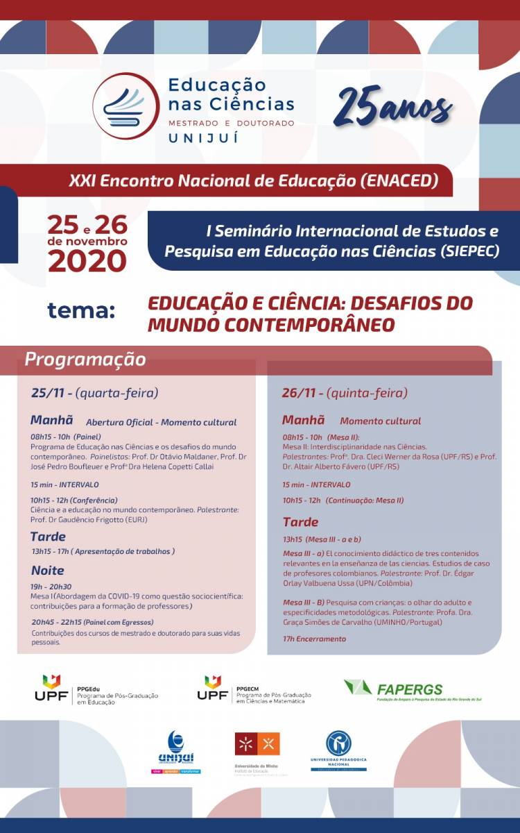 No mês de novembro de 2020, será realizado o XXI Encontro Nacional de Educação (ENACED) e o I Seminário Internacional de Estudos e Pesquisa em Educação nas Ciências (SIEPEC), nos dias 25 e 26 de novembro. Os eventos vão marcar os 25 anos do Programa de Pós-Graduação em Educação nas Ciências (Jubileu de Prata), com homenagem ao professor Mario Osorio Marques, um dos fundadores da FIDENE - UNIJUÍ.