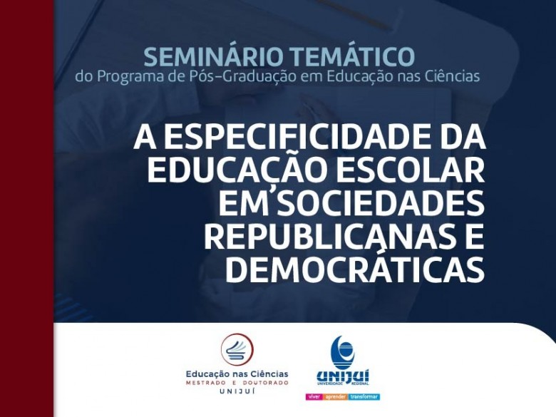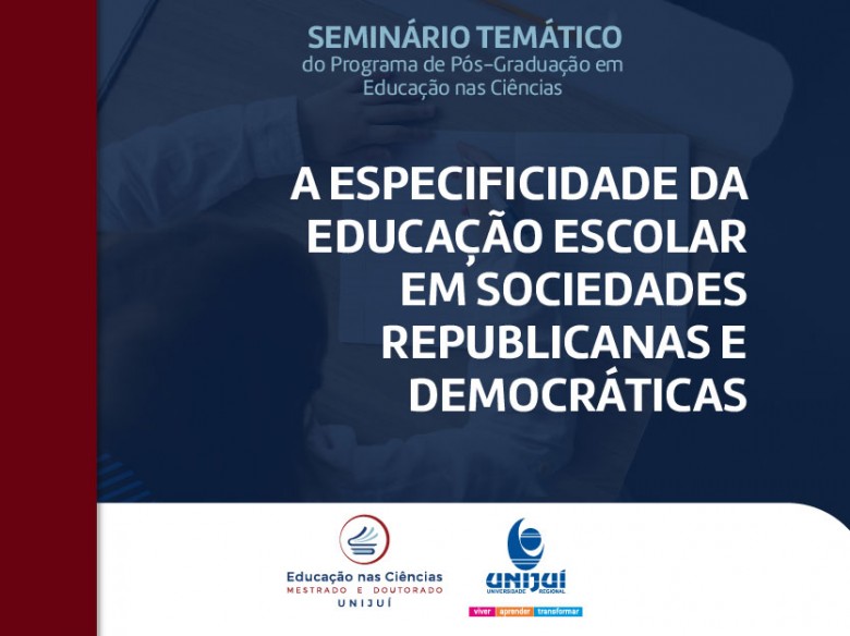 O Programa de Pós-Graduação Stricto Sensu em Educação nas Ciências (PPGEC) da Unijuí, por meio da linha de pesquisa Teorias Pedagógicas e Dimensões Éticas e Políticas da Educação, vai promover seu Seminário Temático com a temática "A Especificidade da Educação Escolar em Sociedades Republicanas e Democráticas". O evento será realizado no Auditório do Complexo da Saúde, nos dias 8 e 9 de novembro. Inscrições com submissão de trabalhos podem podem ser realizadas até o dia 23 de outubro, no endereço unijui.edu.br/eventos.