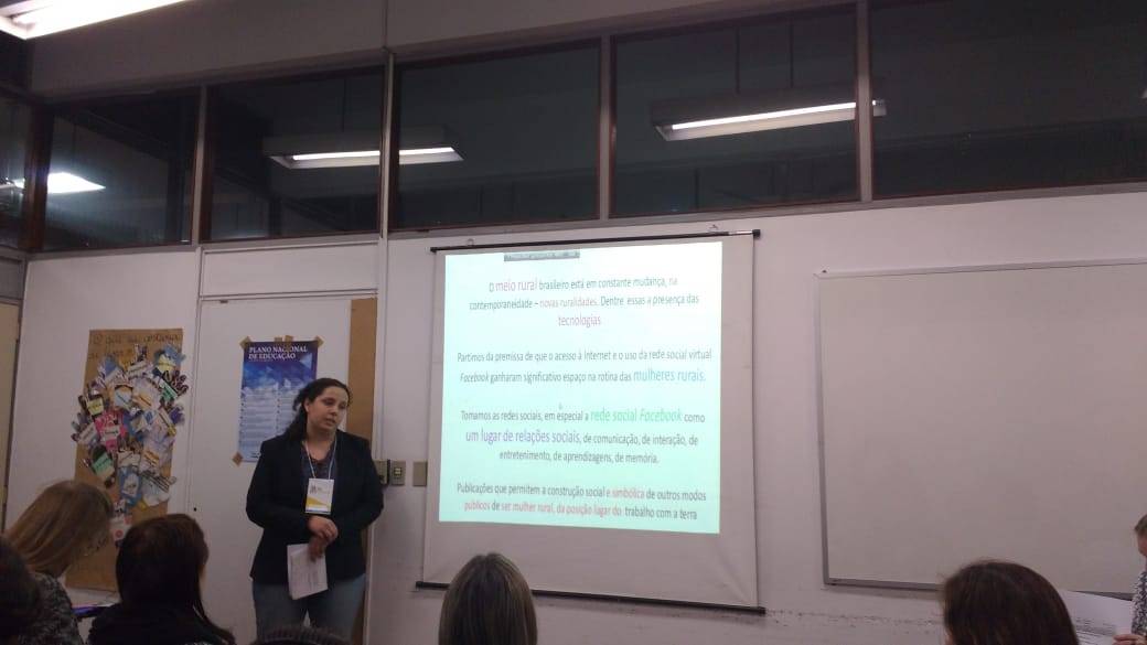 Dentre os diversos trabalhos aprovados para apresentar nos eixos temáticos, destacamos o da doutoranda Naira Giongo Pinheiro, que concentrou-se no Eixo 18 - Gênero e Educação, com a explanação do artigo “A construção social da imagem da mulher rural: publicações na rede social Facebook” de autoria da Doutoranda Naira Letícia Mendes Pinheiro e da ProfªDrª Maria Simone V. Schwengber. O artigo é fruto das pesquisas e estudos realizados em meio ao Grupo de Pesquisa de Gênero, formado por Mestrandas e Doutorandas, sob a Coordenação da ProfªDrª Maria Simone. Cabe destacar a relevância do Evento em meio às valiosas discussões no que tange a esta questão e às muitas abordagens realizadas pelas mesas temáticas, permitindo a convivência com pesquisadores (as) comprometidos (as) com a educação de qualidade, dialogando de forma crítica sobre as ideias e as ideologias que emergem das políticas conservadoras concebidas por este (des)governo que hoje paira sobre o país.