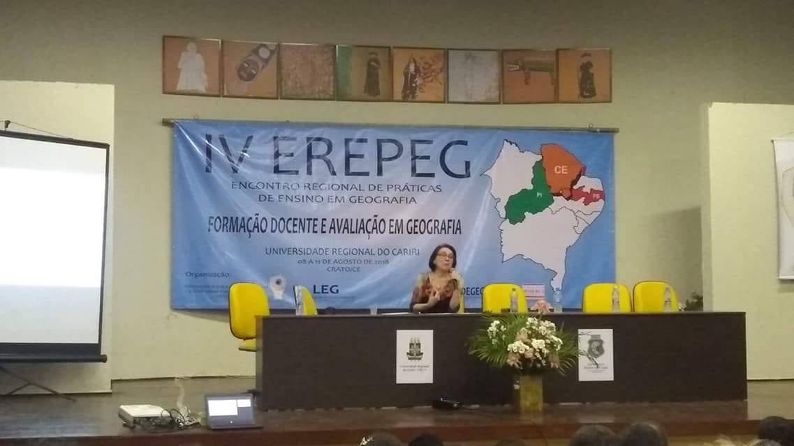 No Ceará, na Universidade Regional do Cariri (URCA) em Crato a professora participou do IV Encontro Regional de Práticas de Ensino em Geografia - Formação Docente e Avaliação em Geografia, de 8 a 11 de agosto de 2018, apresentando a conferência de abertura do evento intitulada: FORMAÇÃO DOCENTE: TEORIA E PRATICA EM GEOGRAFIA.