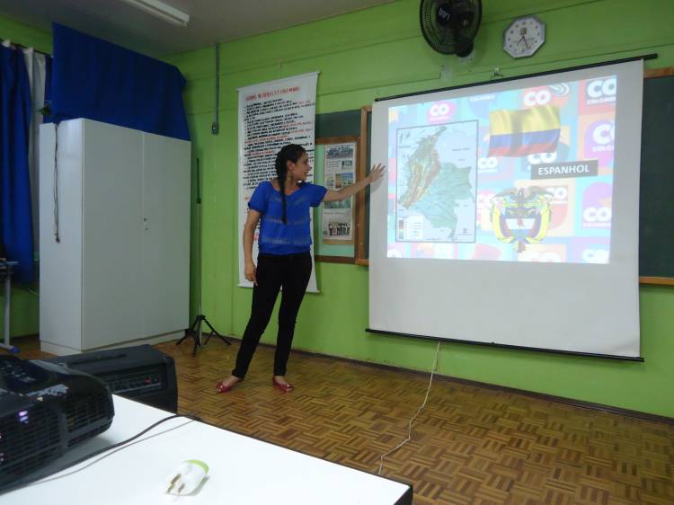 A mestranda em Educação nas Ciências da UNIJUÍ, Natalia Katherine García Ramírez, intercambista da Colômbia/Bogotá, compartilhou experiências sobre a Colômbia aos professores e alunos da Escola Estadual de Ensino Fundamental Chico Mendes, modalidade EJA, no dia 30 de outubro.